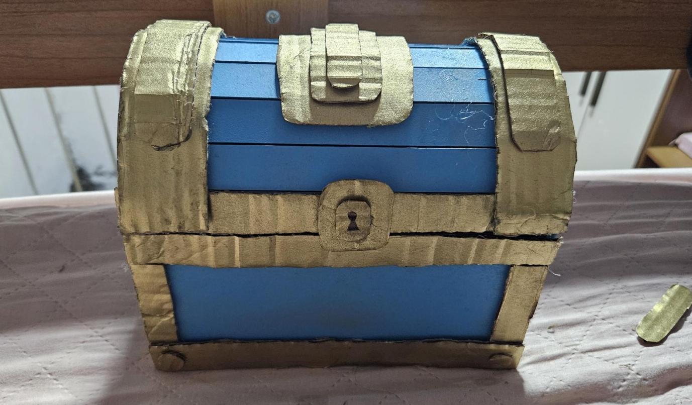 Pintei o MDF com spray azul, e pintei papelão e dentro do baú de dourado.