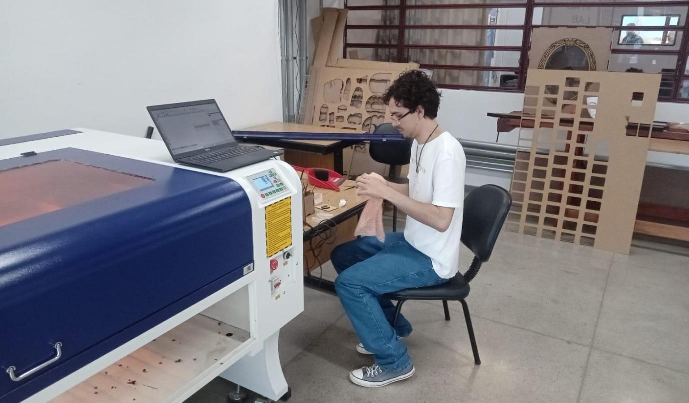 Design feito por mim em parceria com colegas do laboratório. Corte e gravação feito no FabLab.