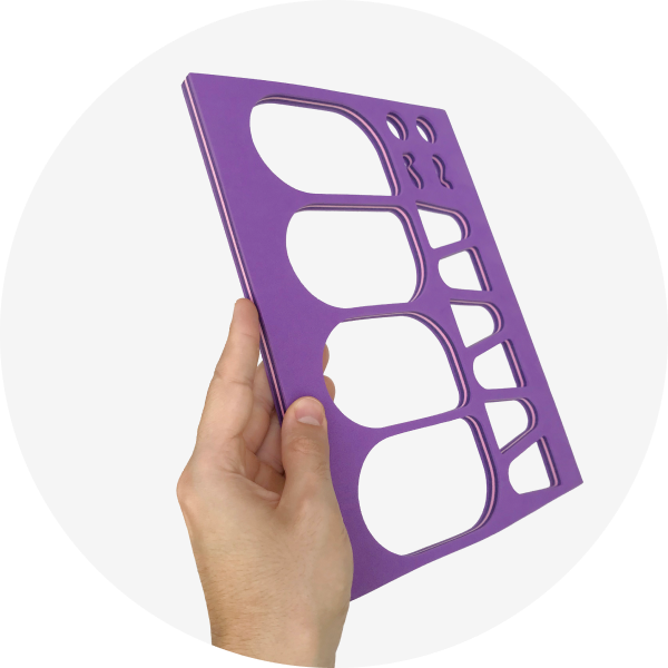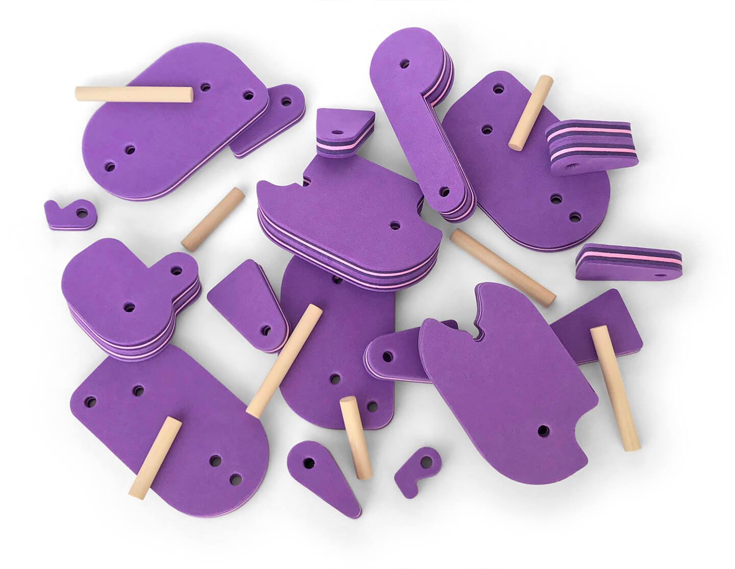 Os protótipos de 2016 foram feitos com placas de 3 e 6mm de MDF cortadas a laser na oficina da FAU USP. Os de 2019 foram placas de EVA de 10 e 20mm cortadas com faca e prensa de corte hidráulica (balancim) em oficina terceirizada. Em 2025 testei uma prensa de corte manual e também estou explorando materiais recicláveis (como placas feitas com tampinha de garrafa).