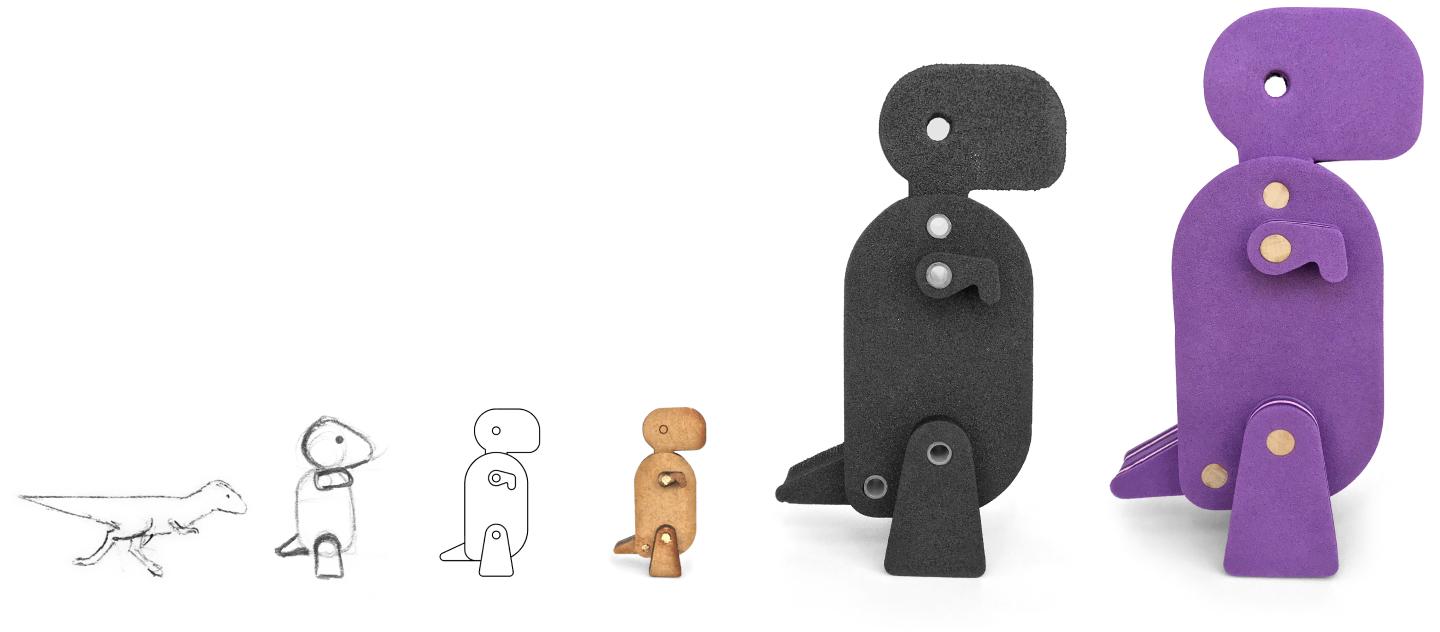 Brinquedos infantis atuais podem deixar pouco espaço para a imaginação. À vezes eles têm muitos recursos (como usar eletrônicos para se movimentar sozinhos ou tocar som), ou ainda podem ser muito realistas, com cores, detalhes, e texturas. Parece que só falta o brinquedo brincar sozinho. Os Montadinos foram pensados como um brinquedo simples, minimalista, mas com personalidade. Que instigasse crianças (e adultos) a observar suas peças e modulares e montá-las. E que permitisse que as pessoas enxergassem em suas formas geométricas simples um olho, uma cabeça de Brontossauro e seu pescoção, uma cauda, e até um bracinho de T-rex.