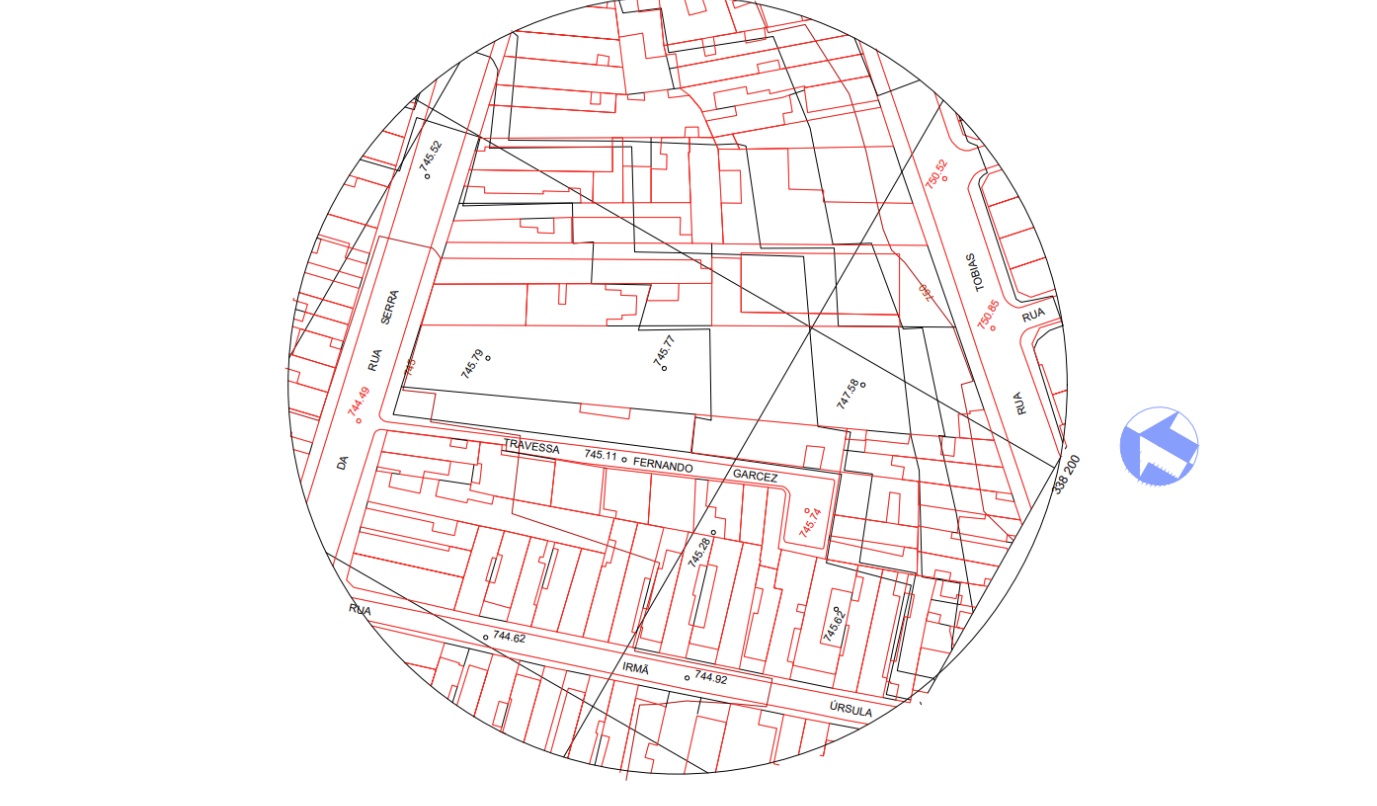 É um terreno com edificações ao redor, no programa autocad