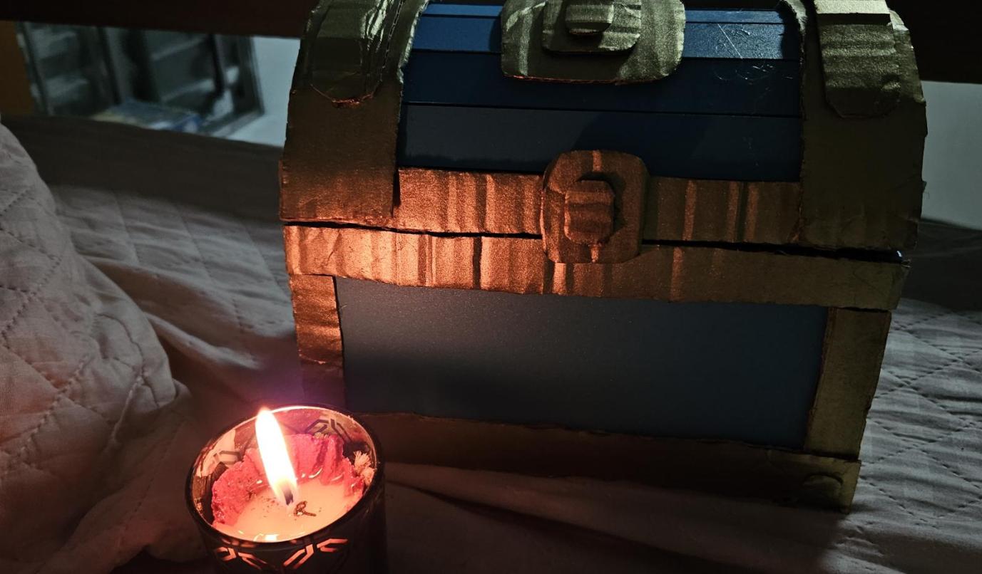 Pintei o MDF com spray azul, e pintei papelão e dentro do baú de dourado.