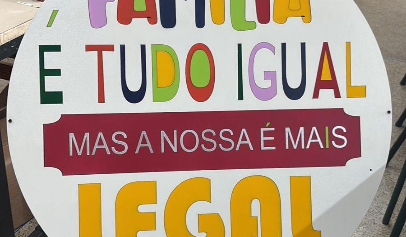 É um painel decorativo com dizeres coloridos.
