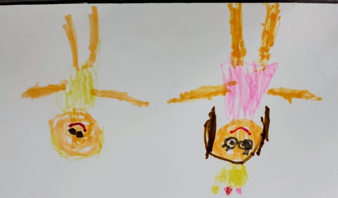 autorretrato criado por uma criança. ela desenhos a si e seu irmão.